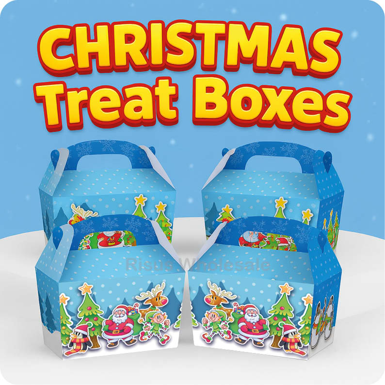 100 party treat boxes packed in 10 packs of 10. Each measures 12 x 12.5 x 6cm. Perfect for filling with sweets and toys. Supplied flat packed.