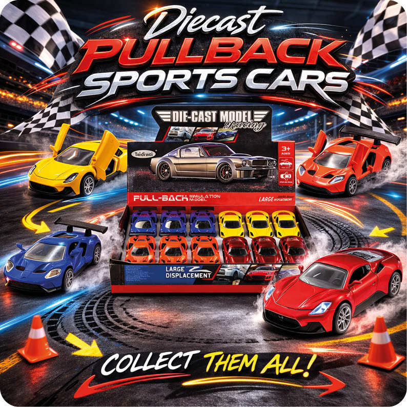 Introducing our fun collection of 12 x Diecast Pullback Sports Cars 1:32, a perfect blend of craftsmanship and playability that will captivate both young enthusiasts and collectors alike. Each model in this set is meticulously designed to replicate the sleek lines and dynamic aesthetics of real sports cars, ensuring an authentic experience for every user.